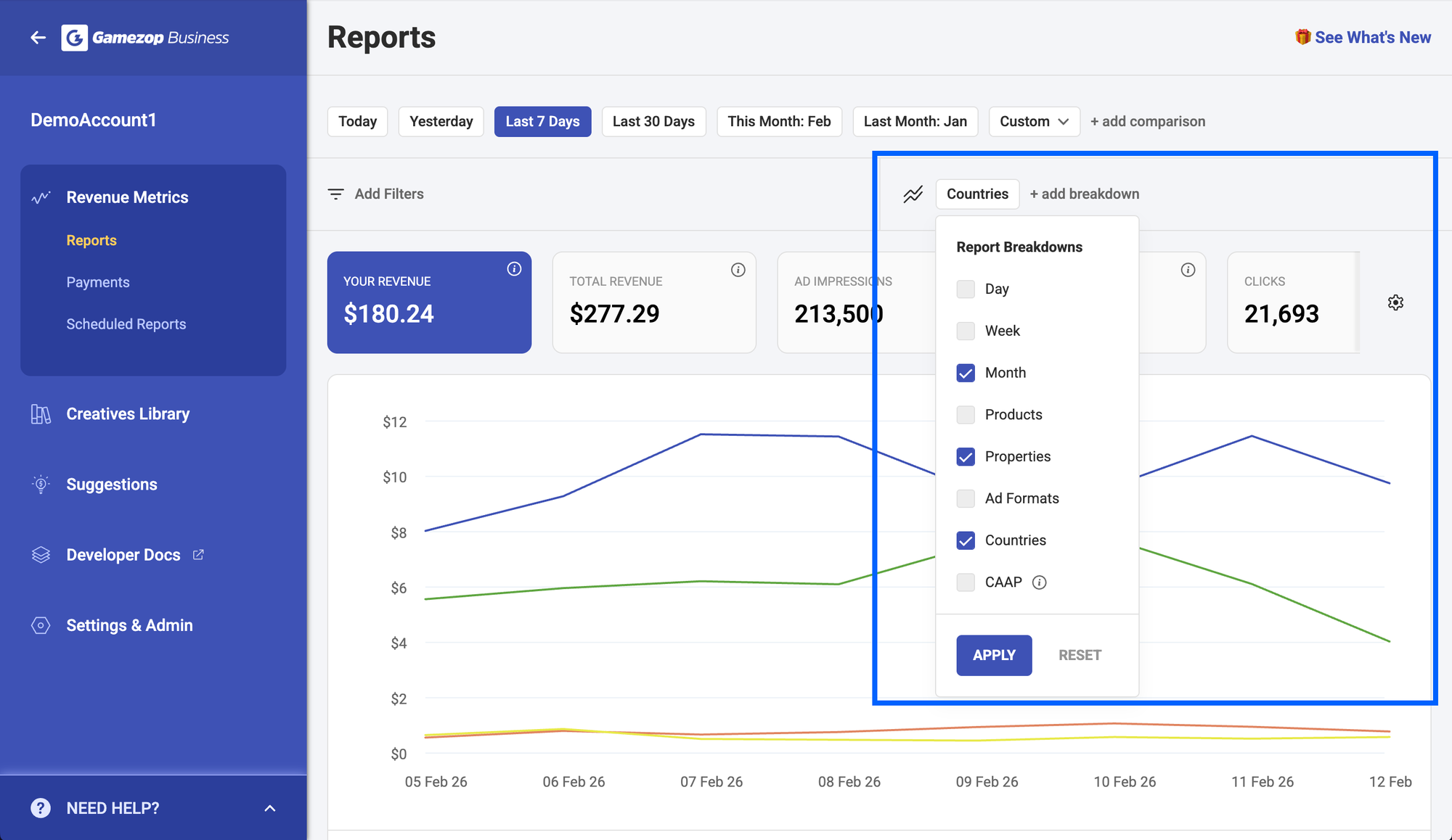 With the new reporting experience, multiple breakdowns can be applied together in a single view. In the same example above, you can now apply all three breakdowns at once (Country, Property ID, and Day) and see how each performs within the same dataset, helping you move from observation to insight much faster.