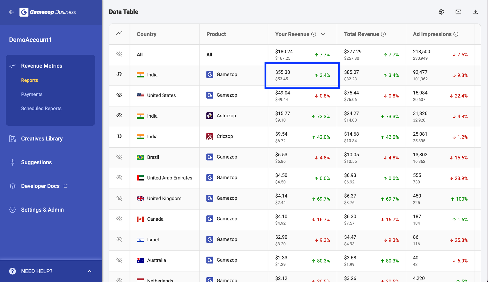 When Publishers send users to our products, we generate advertising revenue, which is shared with them. Our Publishers get access to their revenue data in real time on the Gamezop Business dashboard.