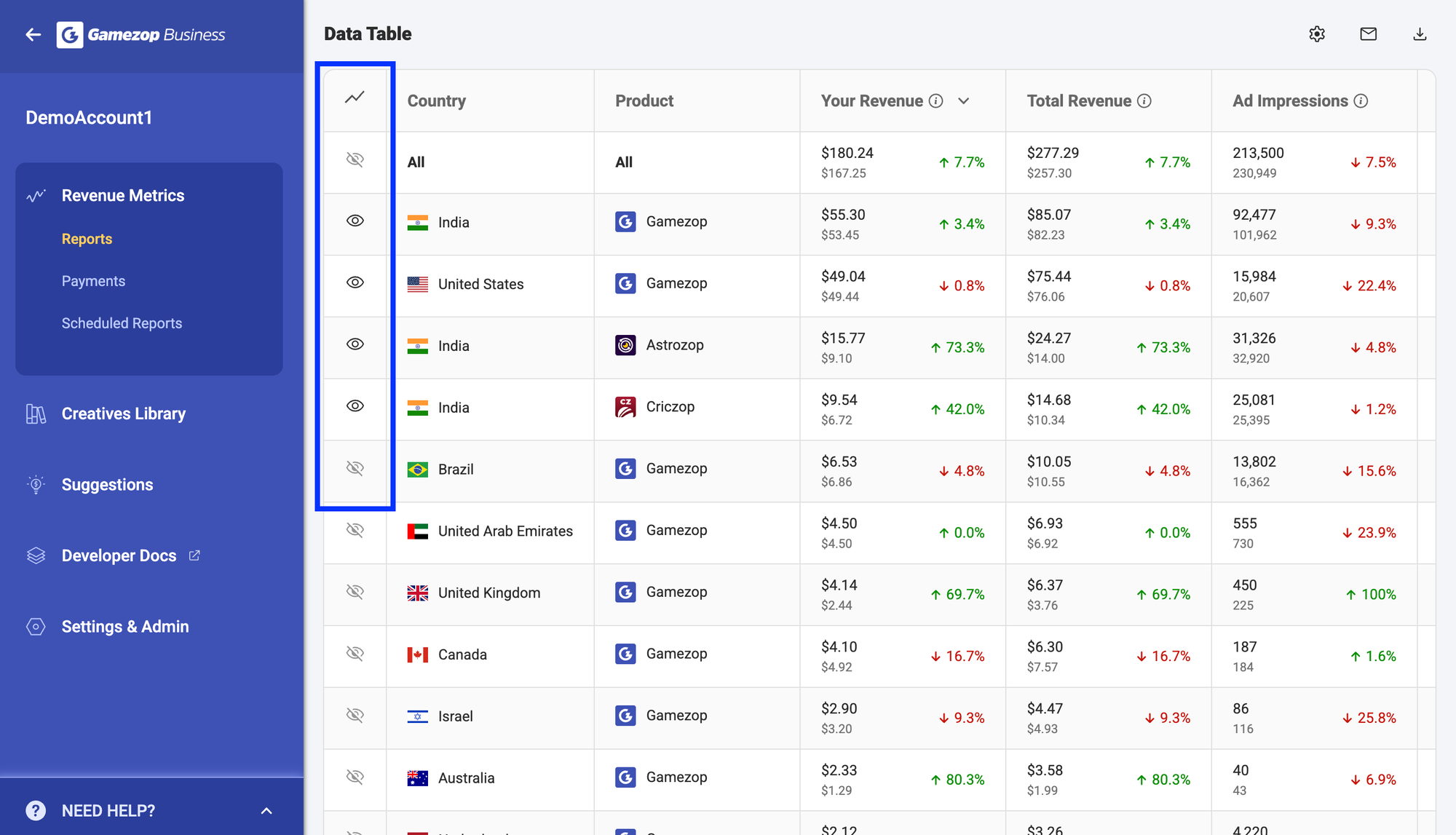 This is especially powerful when combined with the multiple breakdowns feature described above. Want to visualise your data broken down by Country + Ad Format + Product (Gamezop, Quizzop, Astrozop, etc.) and compare this month’s performance to the previous month or the same month last year? The new reporting experience has you covered.