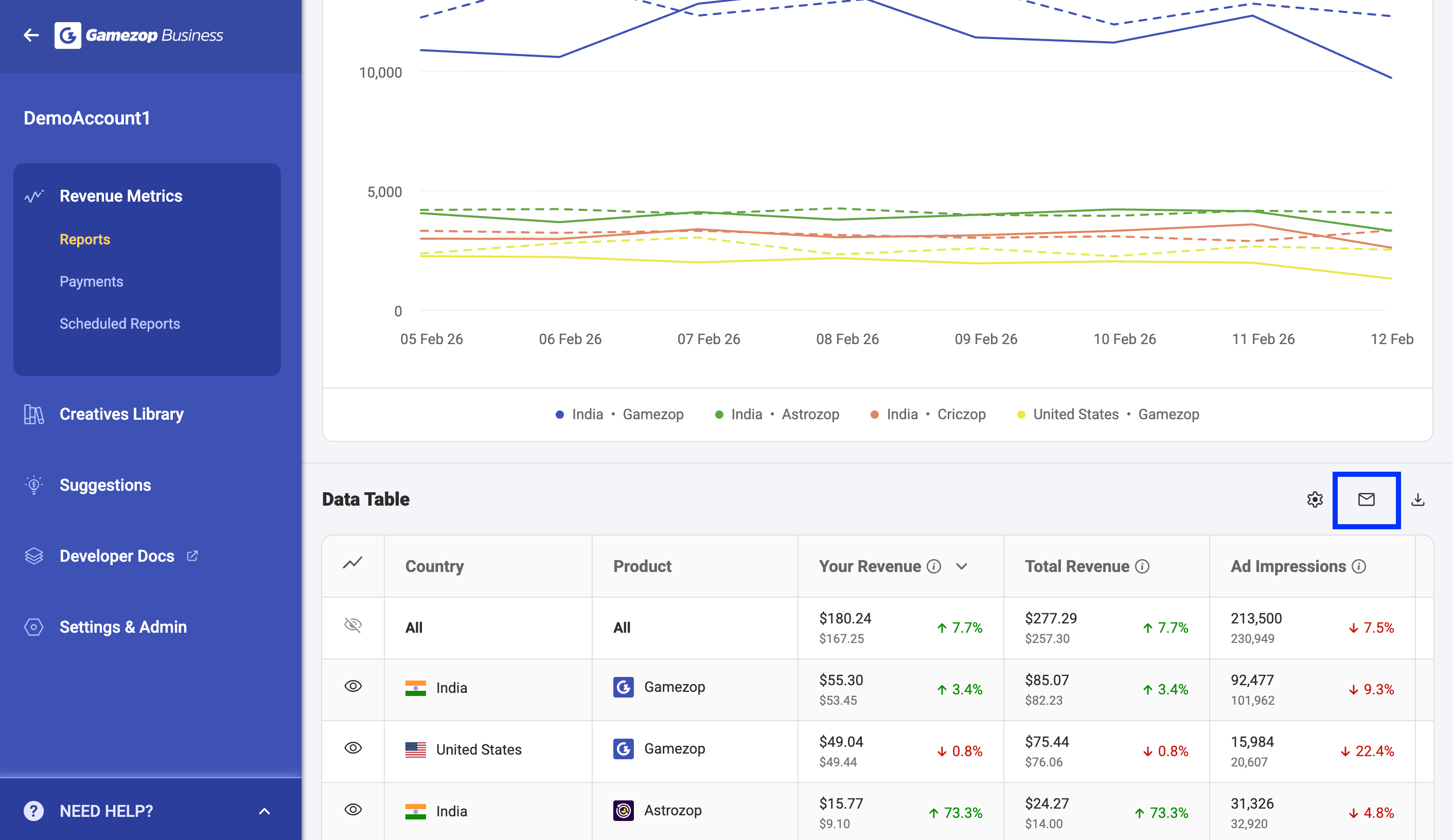 With the new option to email yourself the data you are viewing, you now have a simple way to retain a snapshot of reported data. When you click this icon, an email is sent from no-reply@gamezop.in to the email address associated with your Gamezop Business dashboard account, capturing the data exactly as it appears at that moment. You can later revisit the dashboard, apply the same filters and breakdowns, and compare the data with the snapshot in your inbox.